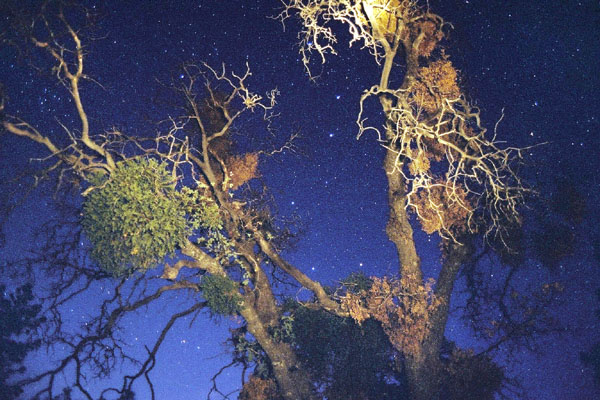 Mountains. The tree was illuminated with a powerful flashlight during a