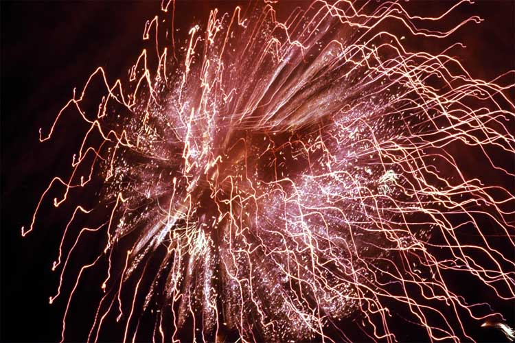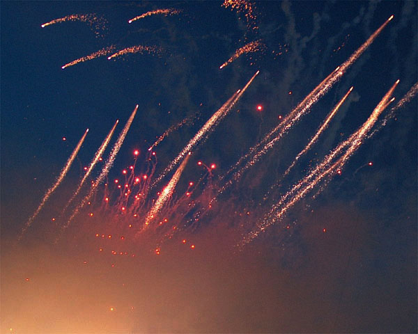 exposure of about 3 seconds of fireworks. Ektachrome 100 film. July Mid