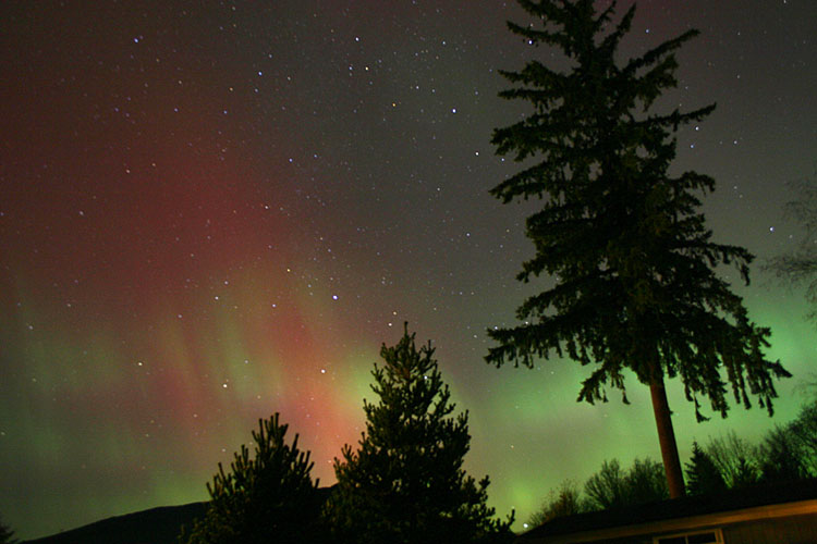 I took this on Oct. 29th at about 1 am. I watched all night the glow to the north, then about 12:30- 1 am it picked up and erupted with reds as bright as brake lights all over the sky, including in this corona overhead.Chrisinda Bowlin - Metaline Falls, Washington, USA |