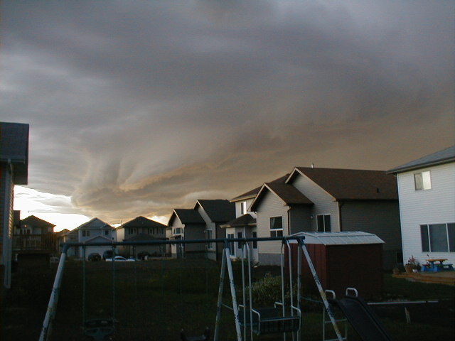 in Center Valley, WI, just before sunset on 2004//06/13. Though it looks like a severe weather system, that is not necessarily the case with this type of cloud. "We thought it looked like an alien spaceship ready to scoop us all up!"e-mail to: Austin Loveless |