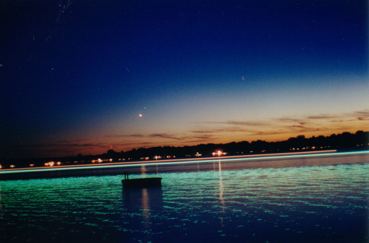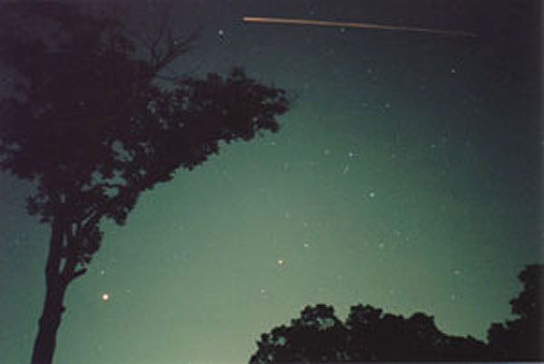 Venus during sunset over Portage Lake in Pinckney, Michigan."The orange stripe going 4/5 the way across the photo from left to right is the running lights on a pontoon boat crossing the lake." Pentax 35mm on Kodak Royal Gold 400 color print film. 30 sec exp e-mail to: Mike Hutchinson - Muncie, Indiana |