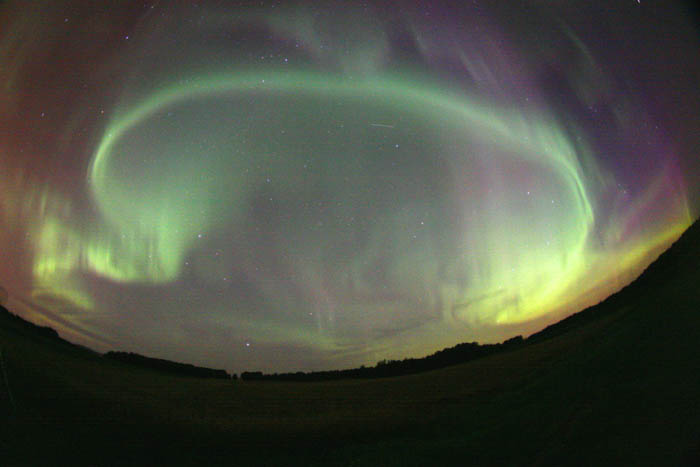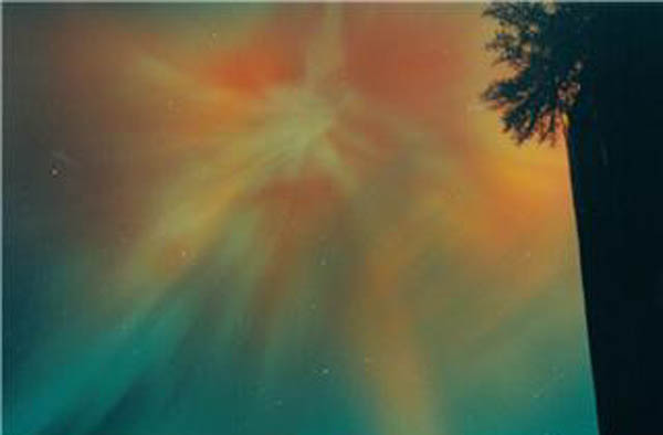 This photo of an aurora corona was taken at Hutch Lake near High Level, Alberta on 3/9/04. Photo details: Fuji 800, 24 mm, f 1.8, exposed for 30 seconds. See more photos by: John Sandy - Deer Park, Washington |