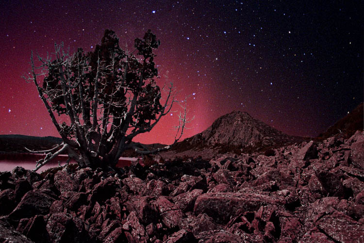 Lake Bowmoral, Tasmania. Composite image, August 18th aurora, November
