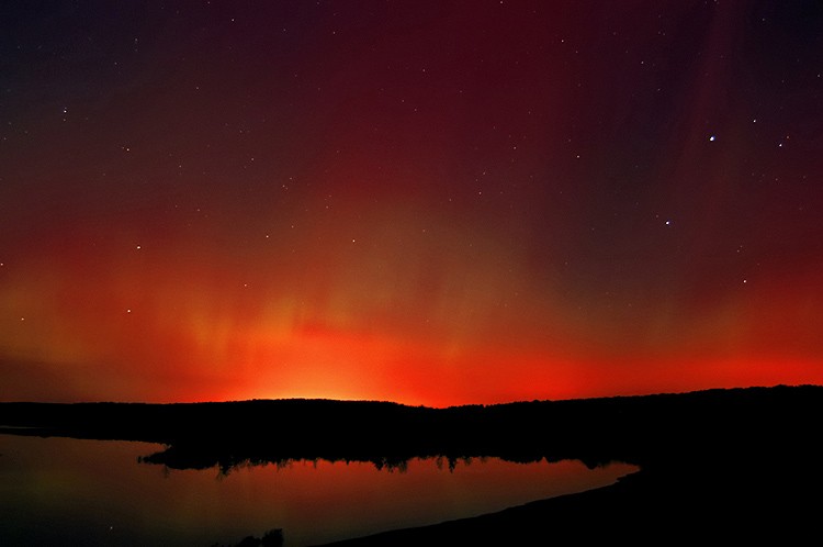 An awesome display of aurora on the night of November 7th. The sky was just covered with pulsing waves, starting in the north, spreading across from the east to the west. Here above my house is an incredible display of reds and greens.See more photos by: William Biscorner - Memphis, Michigan |