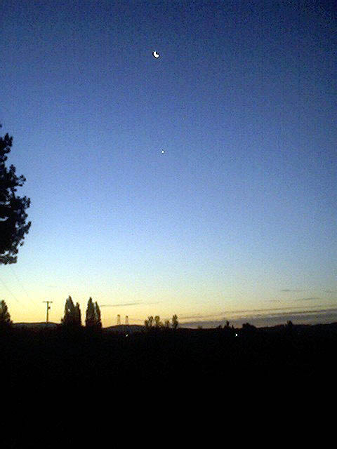 On the morning of Sept. 10th 2003, I shot this beautiful picture of mars chasing a bright orange moon to the horizon. Awesome! Pentax k1000, sigma 70-210mm (at 210mm f/5.6),